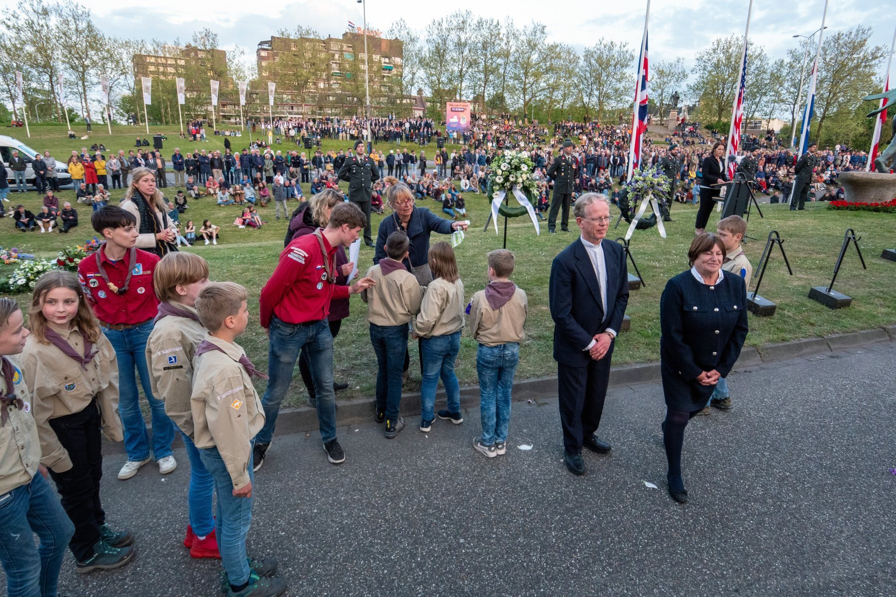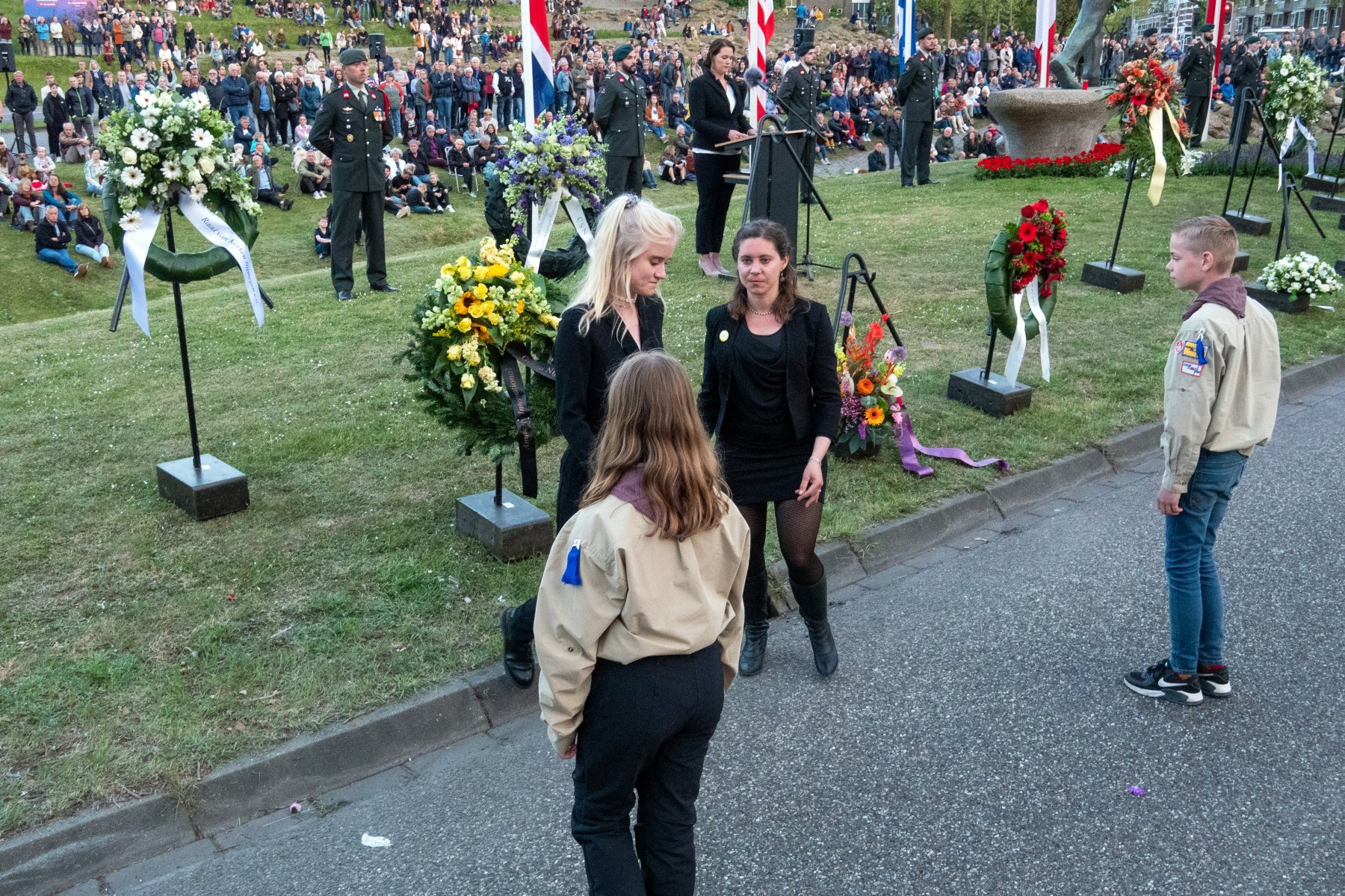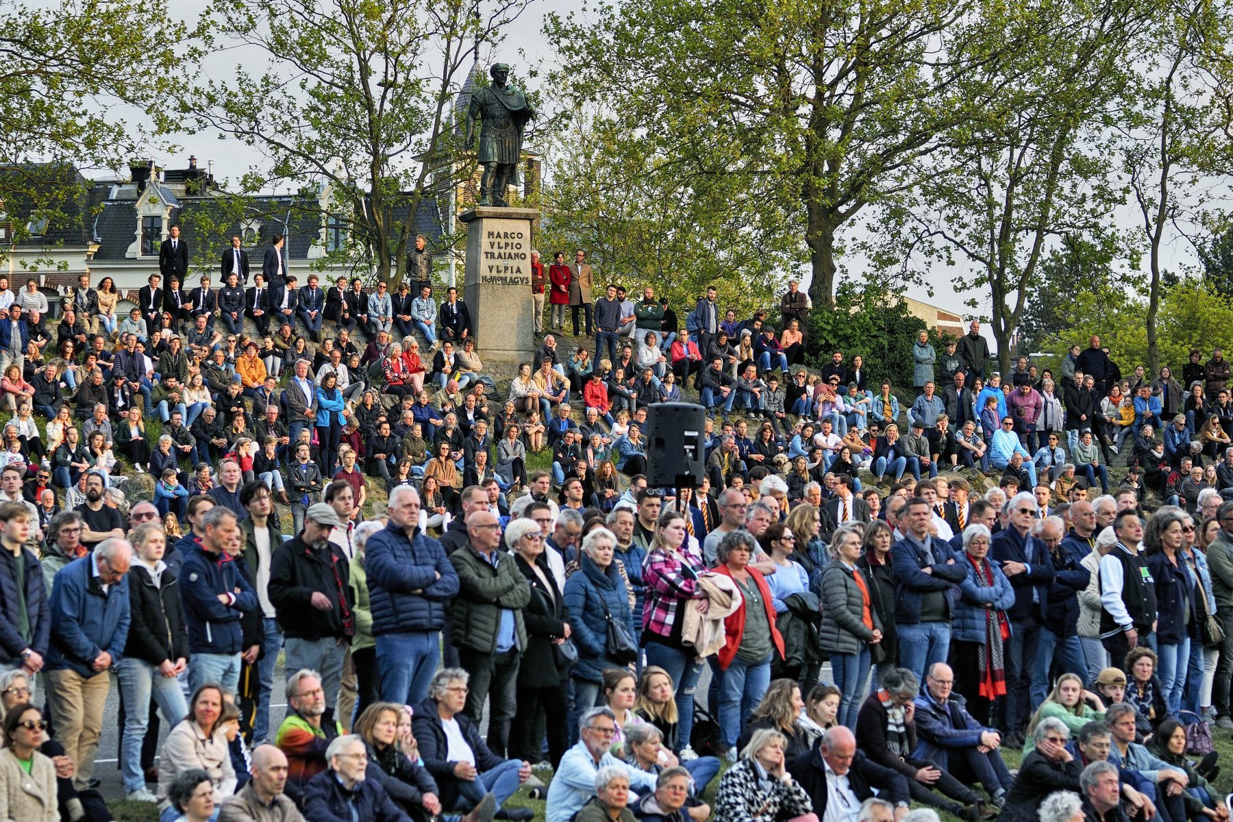 Dodenherdenking 4 mei in Nijmegen aan Keizer Traianusplein. Hier startte om ongeveer 19.55 uur de officiële herdenking en kranslegging.